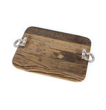 Solid wood serving tray with polished nicket handles measuring 14"L x 19"W x 3"H. Rustic and sturdy, this serving tray is a perfect complement to any nautical home or bar. Makes a great gift for the home, bar, or boat.