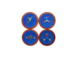 Smathers & Branson Ski Tricks Needlepoint Coasters. Packaged in sets of 4 in a polished brown wooden holder. Bring mountain style to your coctail hour. Makes an elegant Holiday or hostess gift.