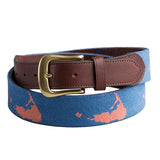 Handmade needlepoint belt with map of Nantucket on a faded navy background. Dark brown leather with brass buckle. For best sizing, add 2 inches to normal pants size. For example, a size 34 pant size should wear a size 36 belt.