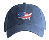 6-Panel Harding Lane Baseball Cap in navy with a red, white and blue map of the USA needlepoint design. 100% cotton. Deep fitting and pre-washed. Adjustable back strap made of white sailcloth with brass clasp. High quality, good looking hat from Harding Lane.