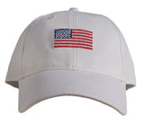 6-Panel White Harding Lane Baseball Cap with a needlepoint American Flag. 100% cotton. Deep fitting and pre-washed. Adjustable back strap made of white sailcloth with brass clasp. High quality, good looking hat from Harding Lane.