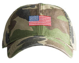 6-Panel Harding Lane Baseball Cap in army green camo with an American Flag needlepoint design.