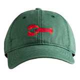 6-Panel Harding Lane Baseball Cap in green with a red lobster needlepoint design. 100% cotton. Deep fitting and pre-washed. Adjustable back strap made of white sailcloth with brass clasp. High quality, good looking hat from Harding Lane.