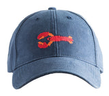6-Panel Harding Lane Baseball Cap in navy with a red lobster needlepoint design. 100% cotton. Deep fitting and pre-washed. Adjustable back strap made of white sailcloth with brass clasp. High quality, good looking hat from Harding Lane.