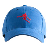 6-Panel Harding Lane Baseball Cap in blue with a retro schuss needlepoint skiing design. 100% cotton. Deep fitting and pre-washed. Adjustable back strap made of white sailcloth with brass clasp. High quality, good looking hat from Harding Lane.