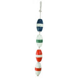 These decorative wooden fishing floats add authentic nautical charm to your seaside home. The buoys hang 4 to a rope and measure 39" long by 3" diameter. Each of the 4 fishing floats is a different color, as pictured.