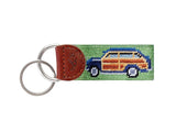 This colorful, hand-stitched Smathers & Branson Woody Needlepoint Key Fob on green background measures 1.25" x 3.25".