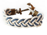 Classic Nantucket-style sailors knot rope bracelet made from a combination of white and navy rope. This Kiel James Patrick bracelet also has an antique brass anchor clasp for easy on and off, so no need to get the siccors out when it gets wet! From the anchor to the sailors knot to the navy and white color scheme, this KJP bracelet is an authentic and classic fashion accessory in and around Nantucket.