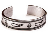 The Silver Sailor bracelet by James Kiel Patrick is handcdrafted from polished sterling silver plating and incorporates an etched whale and anchor pattern befitting of Nantucket. Wear this lovely bracelt alone or layer it for a touch of nautical and classic style.